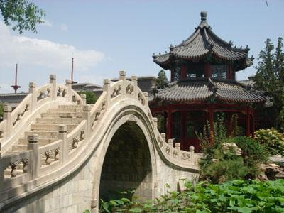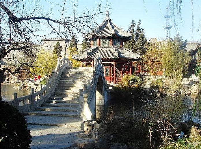 信步蓮池,隨處可遇佳境。園中最大的假山,由溝通南北兩塘的東渠環(huán)抱。山上怪石林立,遠(yuǎn)看有的似玲瓏寶塔,有的像仙鶴引頸,有的如猿猴搔耳,有的同駿馬奔馳。山頂有觀瀾亭,下觀北塘參差錯落的蓮葉,如碧濤波瀾。山中有篇留洞,由塊石精疊巧筑而成,在燈燭照耀下,可見幻影迭生。洞中及洞內(nèi)岸壁上,有乾隆皇帝手書的即景詩刻石。山下有一座漢白玉石橋,原名“綠野梯橋”,為元代所建,與趙州橋有異曲同工之妙。沿橋向東,可通竹林深處的寒綠軒;向西,可去中心島上的藻詠亭。瀏覽一下濯錦亭、高芬軒、紅棗坡、不如亭、六幢亭,以及響琴澗、響琴榭、響琴橋等建筑,也各有佳妙,傳有史話。“蓮葉托桃”,是園中亭頂?shù)莫毺卦煨汀>G色翻卷的大蓮葉正中,托著一只大紅桃。這一構(gòu)制新奇而又自然。傳說八國聯(lián)軍進(jìn)北京時,慈禧太后扮成村婦,連夜出逃。有一位老工匠,便在蓮池設(shè)計了“蓮葉托桃”的亭頂樣式,諧“連夜脫逃”之音,版權(quán)所有山東聊城聊之旅國際旅行社有限公司,轉(zhuǎn)載必究!意在揭露慈禧太后喪權(quán)辱國的丑行。慈禧太后回京路過保定,看到“蓮葉托桃”惱羞成怒,當(dāng)即傳旨?xì)⒘诉@位老匠人。