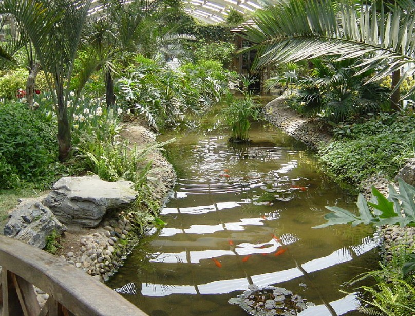位于公園中部,溪流到此處寬狹不等,曲折多變。河兩岸群植竹、杉及灌木,河邊楊柳飄絲,南岸樹叢中隱現(xiàn)一只面積18.5平方米的竹亭。北岸有座呈直角形的綠蔭茶室,墻體為毛石砌就,外形樸素、粗獷,部分建筑伸出水面,有竹甬道與岸相聯(lián),建筑面積350.25平方米。室內(nèi)設(shè)裝飾壁爐,墻上懸掛獸頭鹿角,野趣盎然。景區(qū)南有座三孔石拱橋,長(zhǎng)13米,寬3.1米;橋上的花崗石亭面積10平方米。過橋向西有組蘑菇亭,混合結(jié)構(gòu),面積共30.6平方米,亭下配有石桌石凳。