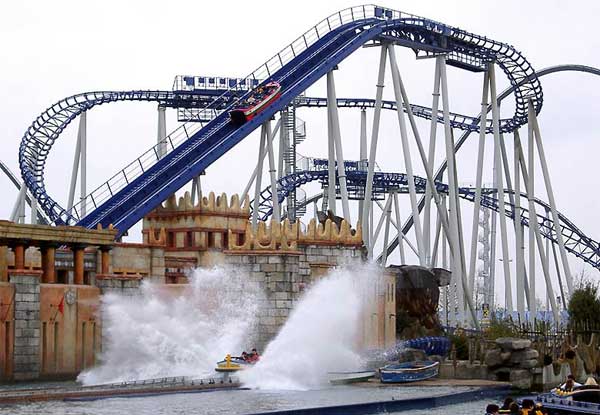 名為“京達(dá)卡”(Kingda Ka)的最新過山車是世界上最快的過山車,它的高度達(dá)到了139米。開始時(shí)水壓彈射器將游客乘坐的車速提高至每小時(shí)206公里,穿過270度的環(huán)形通道,讓人有強(qiáng)烈的失重感。這座過山車有一個(gè)雙軌道站臺(tái),可同時(shí)支持4駕過山車在2條軌道上收放游客,總功率可達(dá)到7400馬力,每小時(shí)可以接待多達(dá)1400名游客。“京達(dá)卡”是目前為止,世界上最高,同時(shí)也是最快的過山車。
