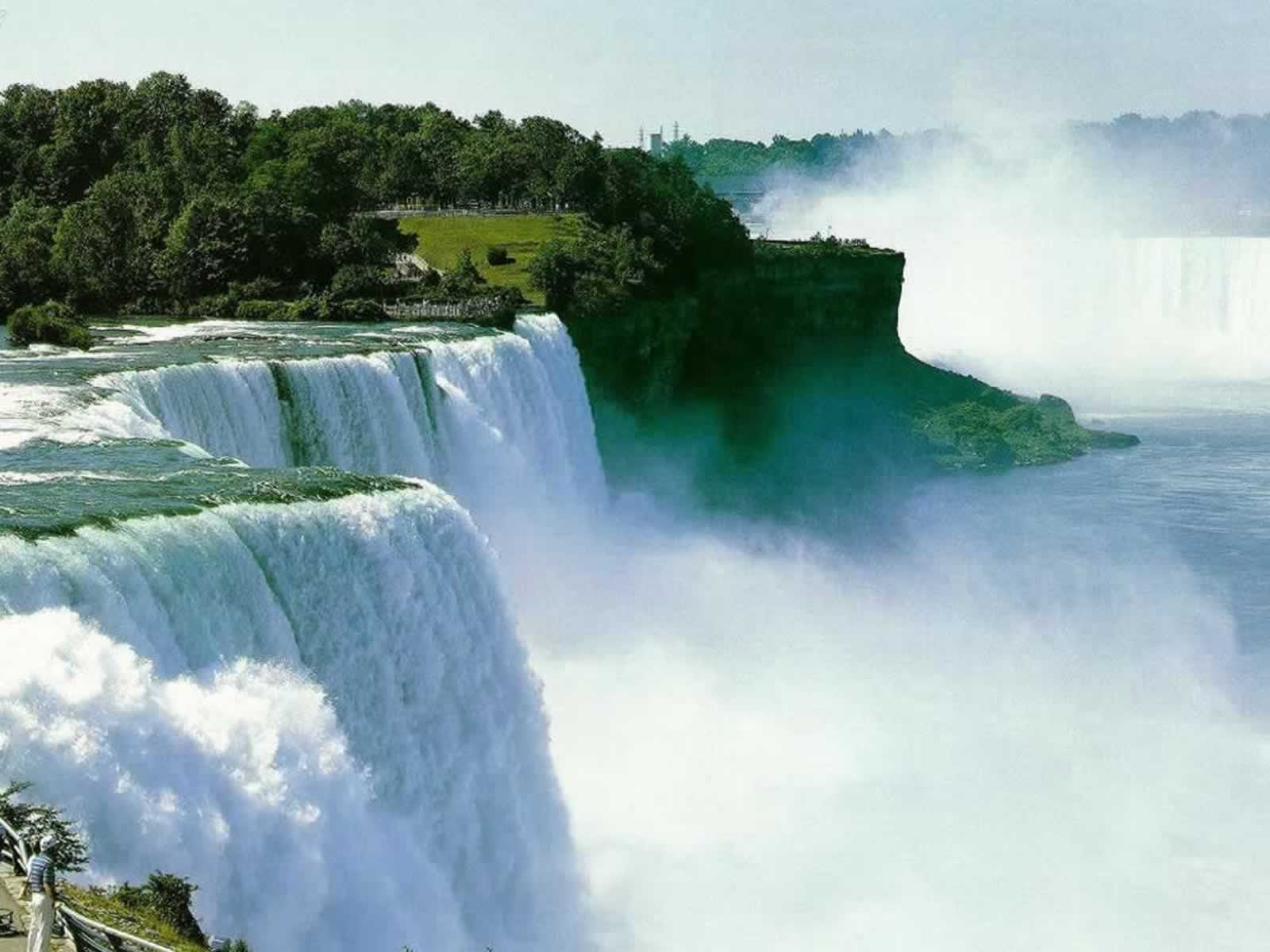 尼亞加拉瀑布其實不是一個瀑布。有人說它由兩個瀑布組成,“加拿大瀑布”和“美國瀑布”--加拿大人多半這么說;如照美國人的說法,則是3個瀑布:“馬蹄瀑布”(Horseshoe Falls,就是“加拿大瀑布”,它狀如馬蹄)、“美國瀑布”(American Falls)和“新娘面紗瀑布”(Bridal Veil Falls)。“新娘面紗”在寬闊的“美國瀑布”旁邊,盡管只細細一縷,卻自成一支,所以美國人“宣告”了它的“獨立”。尼亞加拉的三條瀑布流面寬達1160米(如果加上兩個島嶼,寬可達1240米),雖然分成三股,卻是同一水源,同一歸宿--尼亞加拉河。