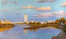 主體思想塔正面,清澈的大同江水潺潺流過(guò),江水中有兩個(gè)大型噴泉,水柱達(dá)150米高,在噴泉的襯托下,主體思想塔更加壯麗、雄偉。可以乘坐高速電梯上至主體思想塔的150米處,俯瞰平壤全景。