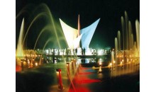位于煙臺經濟技術開發區金沙灘海濱公園正門處,為一圓形階梯狀構筑,整個廣場噴泉灑珠,青草滴翠,花紅樹綠,烏囀鶯啼,使人仿佛置身天上的街市,神奇無比。北部最高點矗立著一組風帆群雕,在碧海藍天間顯現出勃勃生機,象征著開發區在改革開放的大潮中乘風破浪,一帆風順;入夜,這里華燈齊放,燦爛輝煌,風帆通體發光,昂揚向上,寓意著光輝的前景和時代的精神。