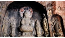 千佛寺石窟又稱萬佛寺、石空寺、千佛洞等。位于延安市黃陵縣西四十公里處的雙龍鎮(zhèn)峪村西,石窟開鑿于半山石崖間。此窟為單室窟,窟口處鑿石為三開間雕石作仿木構(gòu)窟檐,明間寬2.02米,通寬。5.04米。檐柱為八角形,為寶裝覆蓮住礎(chǔ)。柱頭之間以闌額相連,施四鋪斗拱,櫨斗出單抄,令供上施替木,上承檐枋。平柱上有3處宋崇寧年間下(1102~1106)游人題記。