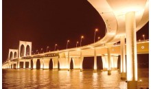 西灣大橋是連接澳門半島和氹仔島的第三座大橋,于2002年10月8日動工興建,主橋于2004年6月28日合龍。西灣大橋北起澳門半島融和門,南至氹仔碼頭,采用“豎琴斜拉式”設計,兩個主橋躉之間跨度達180米。該橋總長2200米,分上下兩層:上層為雙向6車道,下層箱式結構,雙向4車道行車,可以在8級臺風時保證正常交通,橋內還預留了鋪設輕型鐵軌的空間。