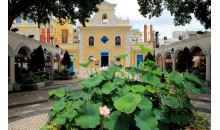 龍環(huán)葡韻是澳門八景之一,以住宅博物館為中心的典型葡萄牙人生活方式及場景。在凼仔島南岸的海邊馬路上,有1921年建造的五幢標(biāo)準(zhǔn)葡式小別墅,青白兩色的墻面,有雙層的和單層的,前廊和露臺,是典型西歐的建筑風(fēng)格
